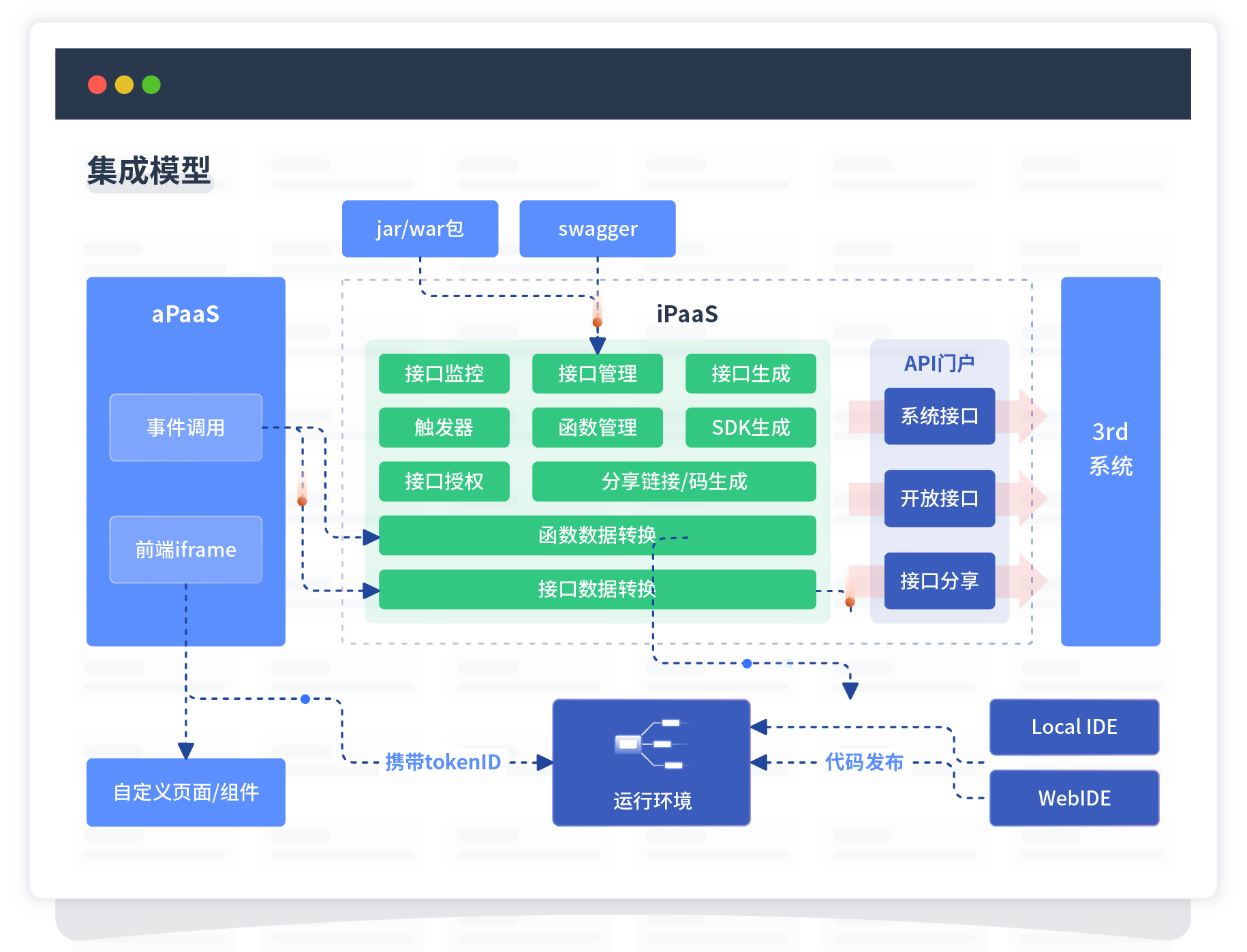 集成模型包括平台本身前、、后端能力的扩展,,,,也支持通过API门户和第三方系统进行交互。。