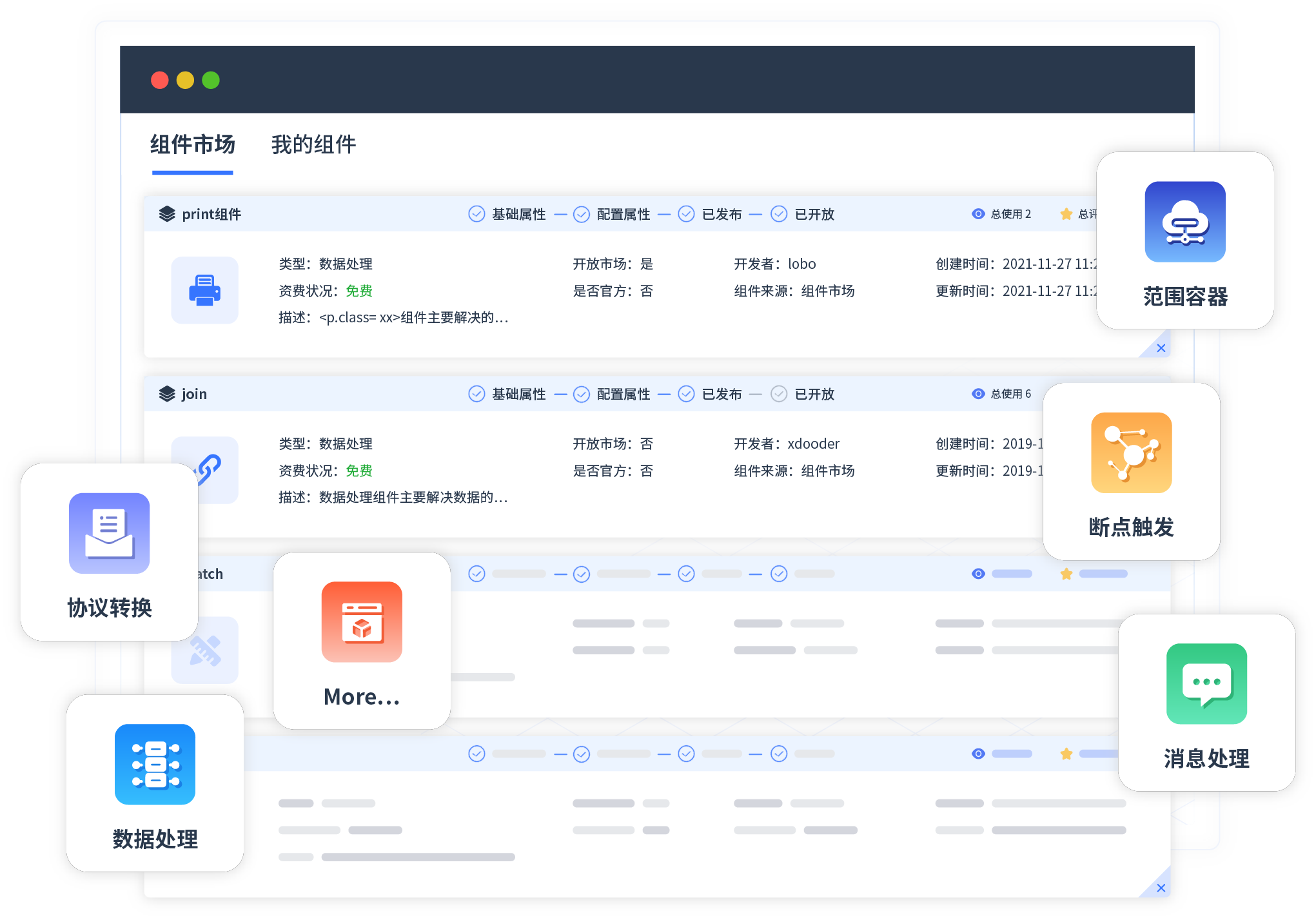 针对集成场景,,,美团钱包商家版提供组件市场,,,,例如协议转换、、消息处理、、、文件操作等。。。除平台提供的组件外,,,客户可以自定义所需组件。。。
