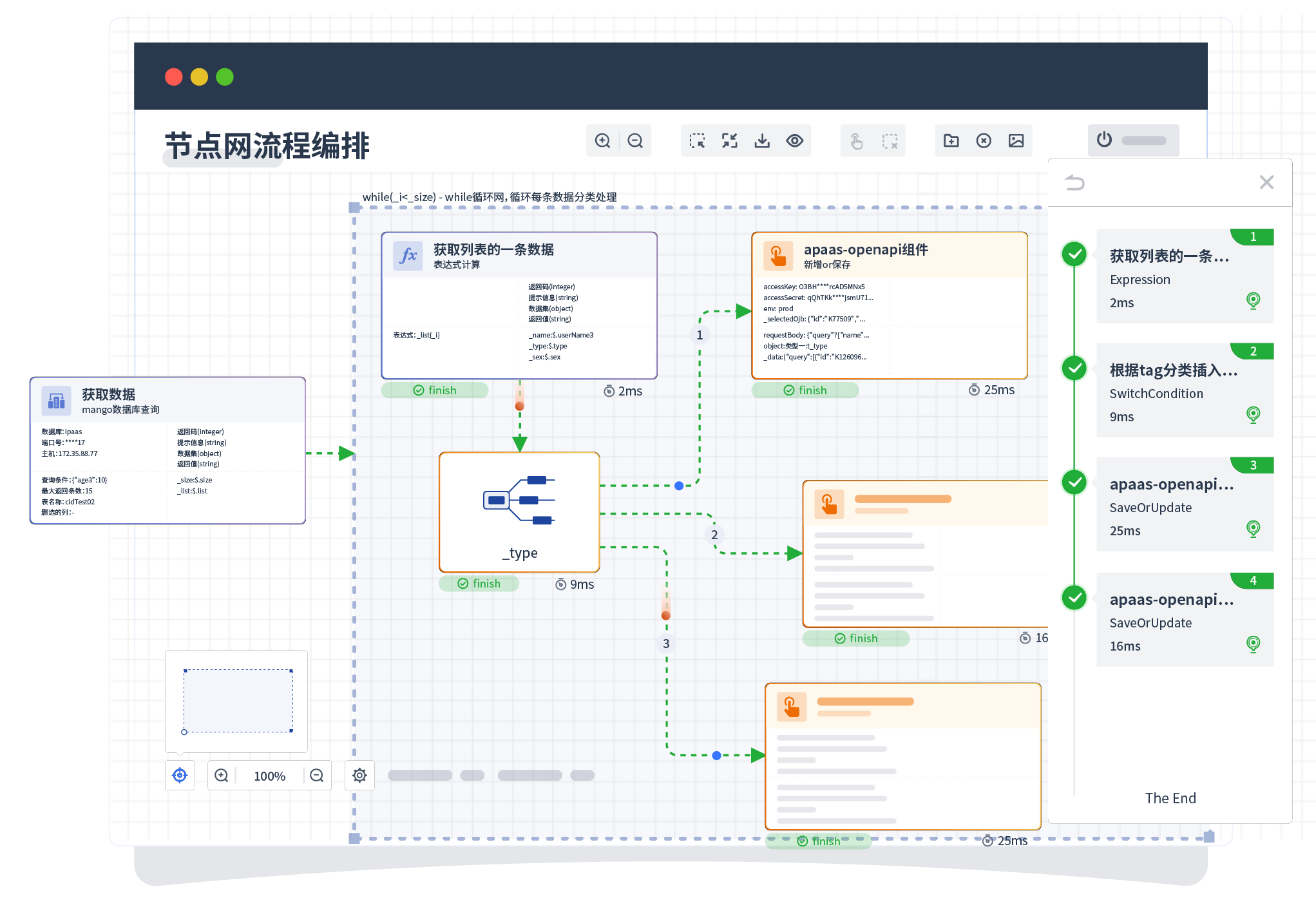 针对集成场景,,,,组件定义后支持进行流程编制,,,不同于传统代码方式,,,,通过图形化展示,,支持在线调试、、、日志查看和运行回放。。