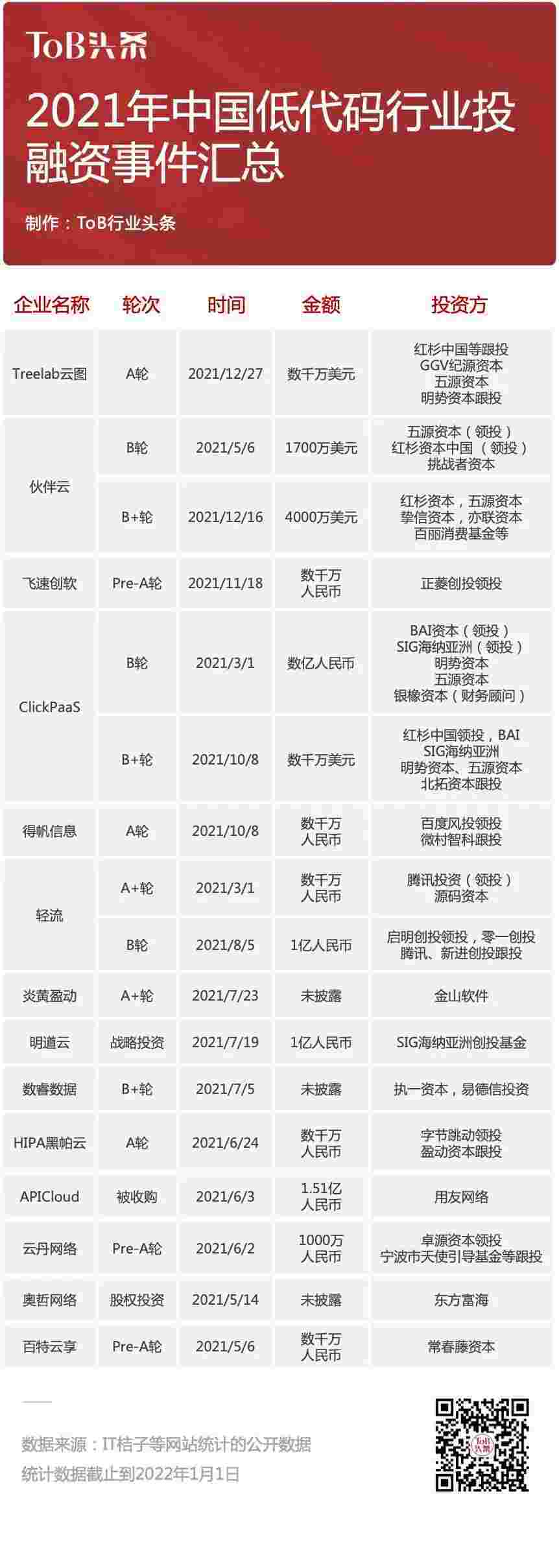 到2021年,,,无/低代码投融资规模势头更甚,,其中包括轻流两轮融资(A+轮数千万人民币,,,,B轮近亿人民币)、、、、美团钱包商家版 两轮融资(B轮数亿人民币,,,,B+轮数千万美元)、、、、百特云享数千万元Pre-A轮融资......