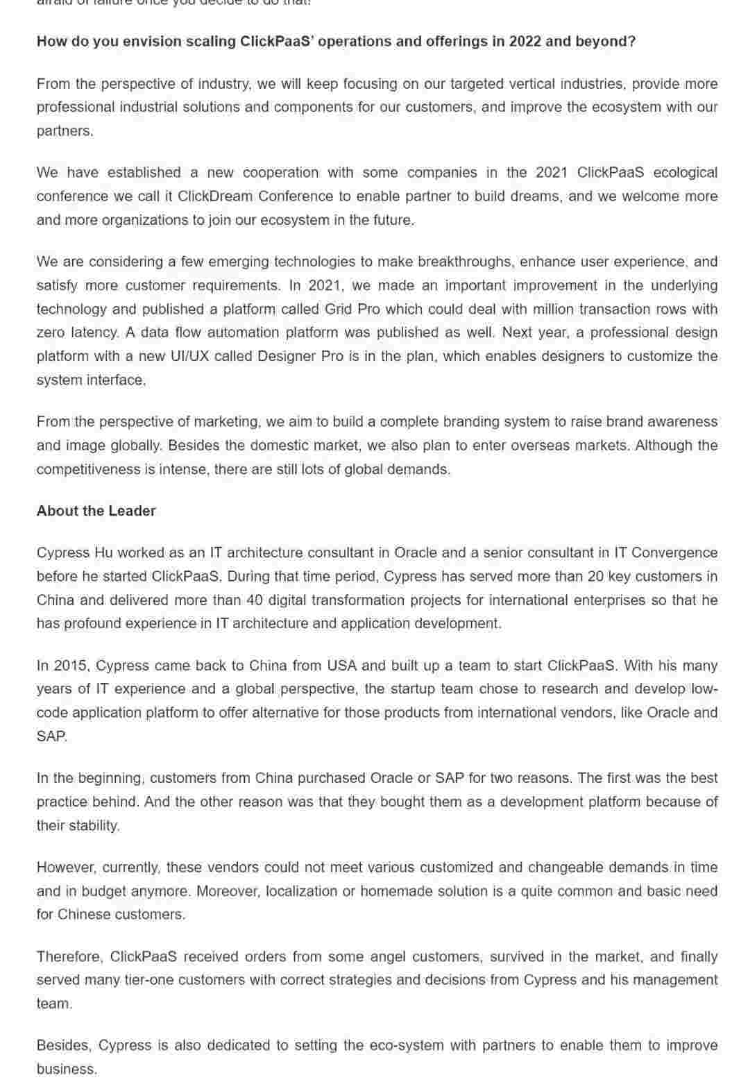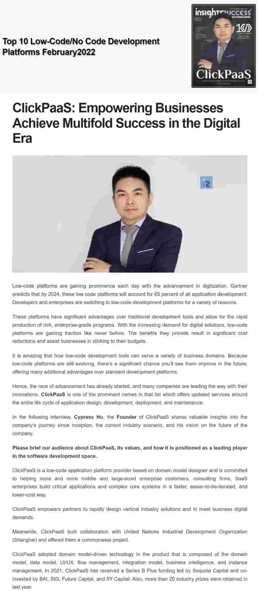 2022年年初,,,,美团钱包商家版入选外媒Insights Success低代码/无代码开发平台 Top10,,创始人、、CEO胡柏受邀接受专访并荣登封面人物,,,他与Insights Success的读者分享了美团钱包商家版成立的初心、、发展历程、、当前的行业发展趋势以及他对公司未来的展望。。